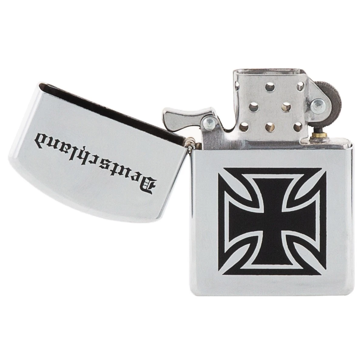 Tolles Sturmfeuerzeug von MFH mit Abzeichen Eisernes Kreuz Deutschland. Das Benzin Sturm Feuerzeug ist auch bei Wind und Regenwetter einsatzbereit. Der Tank kann aus der Schale herausgezogen werden und wird dann mit handelsüblichem Feuerzeug Benzin gefüllt