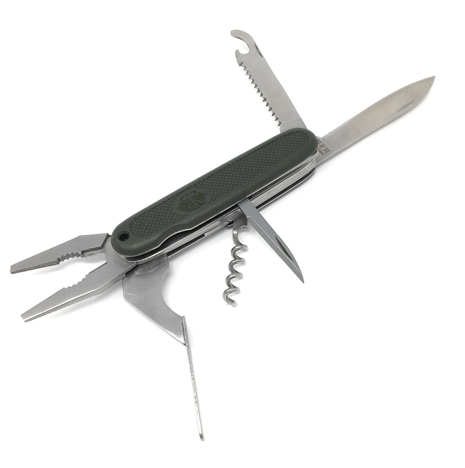 Das klassische BW Offiziers Taschenmesser mit praktischen Werkzeugen wie Messer, Zange, Säge, Schraubendreher, Flschenöffner usw. Das Bundeswehr Taschenmesser Offizier ist kompakt in der mitgelieferten Gürteltasche zu verstauen. Auf den oliven Griffschalen aus Kunststoff ist der deutsche Bundesadler versehen.