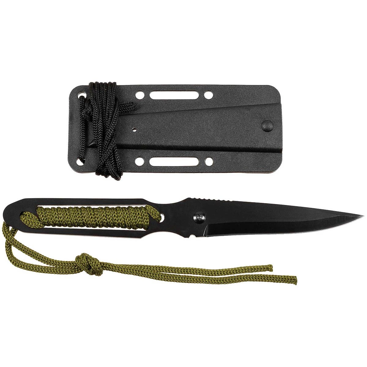 Das Messer Action II von Fox Knive mit hochwertiger Tantoklinge und umwickelten Griff aus olivem Nylonband. Die stabile Kunststoffscheide mit Gürtelclip und Nackenband sorgt für den sicheren Transport.
