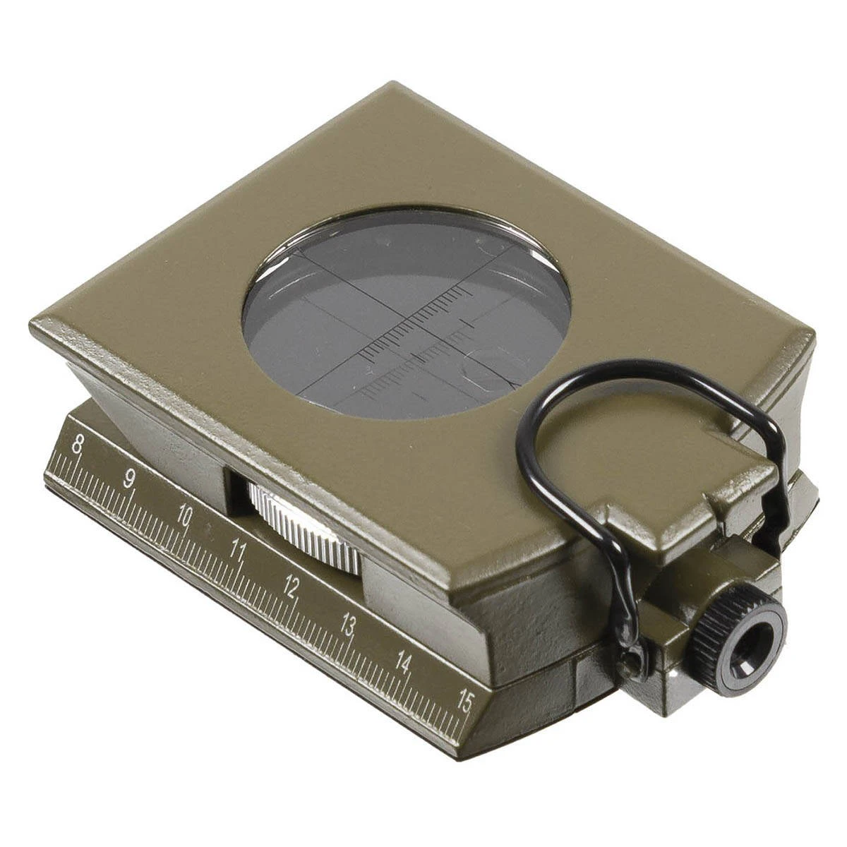 Der italienische Militär Marschkompass von MFH ist flüssigkeitsgedämpft und in einem sehr stabilem Metallgehäuse verbaut. Das Gehäuse des prismatischen Kompass besitzt eine Anlegekante mit Maßeinteilung in 1:25000 zum Abmessen auf der Karte. Das Im Sucher befindet sich ein Vergrösserungsglas zum einfacheren Justieren der Richtung. Die Kompassscheibe ist mit einer 360-Grad-Skala versehen. Darauf ist Norden mit einem grünen Pfeil angezeichnet, Ost, Süd und West sind mit den jeweiligen Kürzel gekennzeichnet. Eine Besonderheit ist die vergrößernde Linse an der Vorderseite des Kompass-Unterteils. Durch sie blickt man direkt auf den Rand der Kompassrose und kann dort die Marschzahl mit sehr hoher Genauigkeit ablesen. Ausserdem besitzt der Marschkompass einen Klinometer zum Messen von Neigung und Höhenunterschied. Durch die fluoreszierende Markierungspunkte kann der Kompass auch bei eintretender Dunkelheit noch sehr gut abgelesen werden.