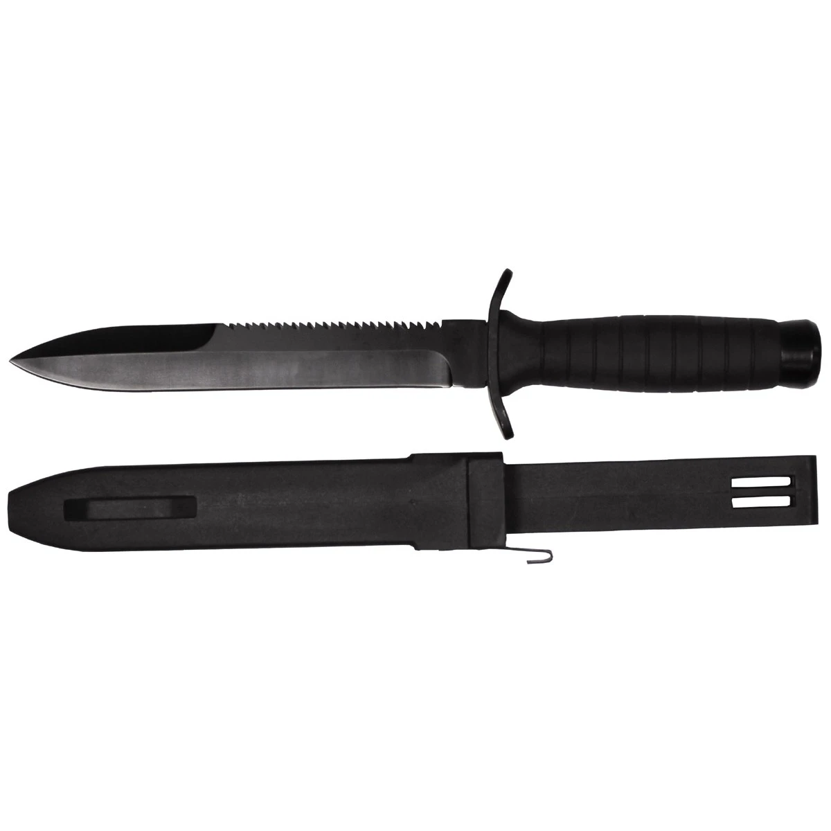 Das Kampfmesser Strike von MFH ist ein leichtes und dennoch sehr solides Feldmesser in schwarz mit Sägerücken. Der Griff aus TPR (Termo Plastic Rubber) ist Kautschukähnlich und liegt somit unglaublich gut und sicher in der Hand. Die Lederscheide ist aus festem ABS-Kunststoff ist einem Gürtelclip ausgestattet und bietet eine sehr gute Messer-Arretierung. Die Stahlklinge ist mit einer Spezialbeschichtung gegen Korrision versehen. An Rückseite der Klinge befindet sich eine Sägezahlung mit der auch schnell Äste oder kleinere Baumstämme durchsägt werden können.