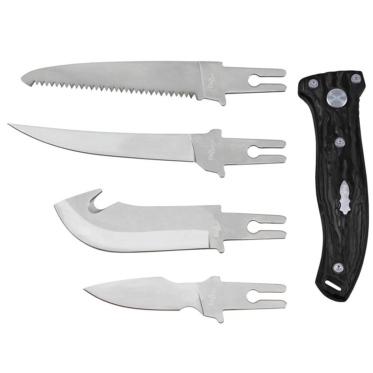 Das Messerset Hunter mit 4 Wechselklingen aus Edelstahl ist das ideale Werkzeugset für die Jagd. Der stabile, ergonomisch gefortmte G10 Griff lässt 3 verschiedene Klingen und eine Säge per Knopfdruck aufnehmen. Das 5 teilige Set besteht aus dem stabilen Griff mit Fangöse, einem Universalmesser, einem Ausbeinmesser, einer Skinner-Klinge mit Aufreißhaken und einer Sägeklinge. Verstaut und Transportiert wird das Messerset im praktischen Nylon-Etui mit Gürtelschlaufe.