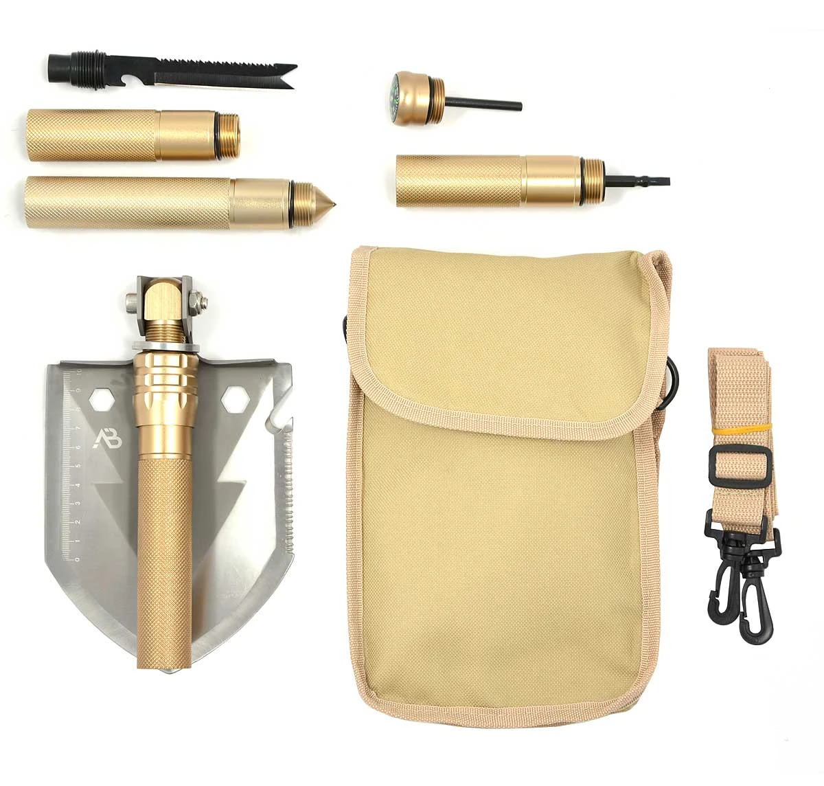 Der Multifunktions Spaten Deluxe I in der Farbe Gold von A.Blöchl hilft mit vielen praktischen Tools und Funktionen. Die Multifunktions Outdoorschaufel aus einem Materialmix mit Carbonstahl und Aluminium ist leicht, rostfrei und dennoch extrem Stabil. Das Multitool besteht aus mehreren Einzelteile, die jeweils eine eigene Funktion haben und nach dem Zusammenschrauben eine 66cm lange Schaufel ergeben. Das Schaufelblatt kann entweder als normale Schaufel oder im 90° Winkelt arrettiert als Hacke verwendet werden. Durch die einseitig geschärfte Kante können auch kleinere Äste abgehackt oder als Eispickel härtere Teile ausgebrochen werden. Die zweite Schaufelseite ist mit scharfen Sägezähnen versehen und dient als Astsäge bzw. Hochentaster. Zusätzliche Funktionen des Sets sind Schraubendreher, Glasbrecher, Flaschenöffner, Messer mit Sägerücken und ein Feuerstarter. Mit im Lieferumfang befindet sich eine Transporthülle mit Gürtelschlaufe und Trageriemen.